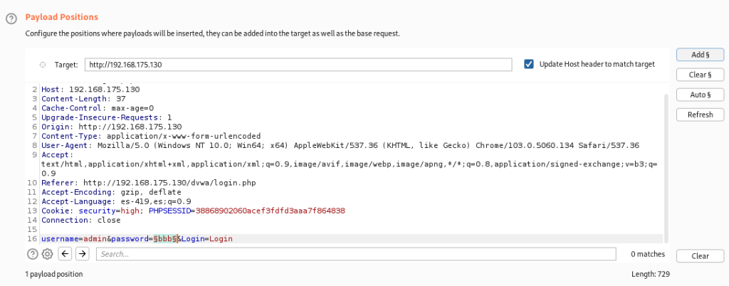 - Después, modificaremos la petición. En el campo «username», ingresaremos el valor «admin» (que sabemos que es el nombre de usuario de DVWA por defecto). Seleccionaremos el campo password de nuevo con el botón add, lo cual se verá de la siguiente forma: