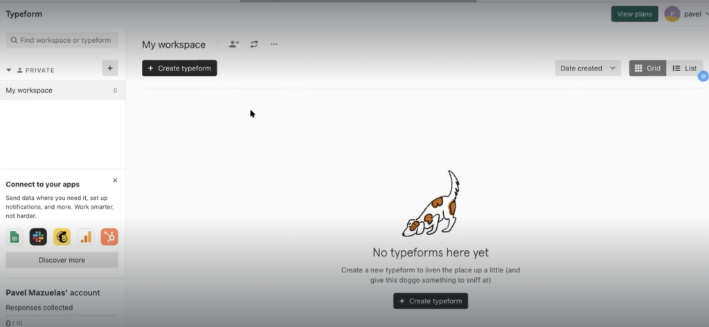 👉 Prueba gratis el Bootcamp en Marketing Digital y Análisis de Datos por una semanaCuando te des de alta, te vas a encontrar con un grupo de ventanas donde encontrarás la posibilidad de visualizar tu workspace o espacio de trabajo. Tendrás que dirigirte a esta ventana. Ahí encontrarás todos los formularios que has realizado. Ahora todavía no tendrás ninguno, por lo que vas a crear uno nuevo en el botón negro de «Create typeform».
