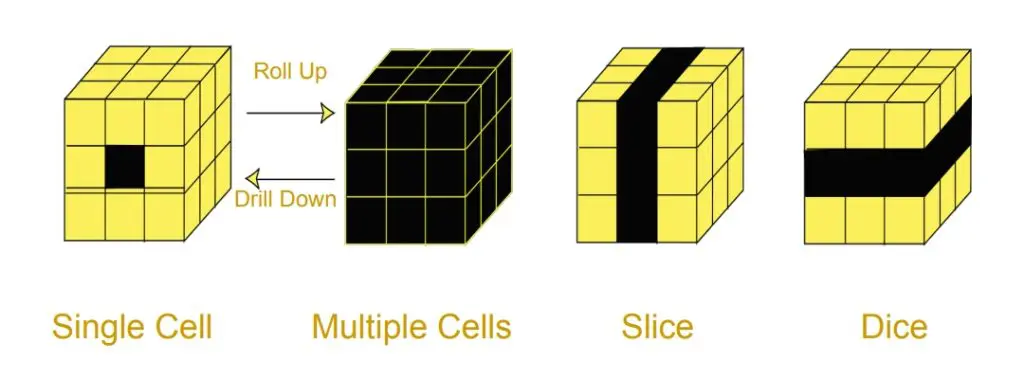 Los cubos son estructuras de datos en las que la información se ordena de manera jerárquica. En los cubos se pueden realizar mapeos rápidos de diferentes categorías de datos alojados en diferentes cubos y se cruzan entre ellos para acceder de manera rápida a las consultas realizadas. Los cubos no son figuras en un sentido estricto; se denominó así a la forma de alojar los datos debido a su multidimensionalidad, ya que esta recuerda la forma de un cubo. Esto se debe a que se puede mirar por distintos lados, lo cual no reduce los datos a un solo punto de vista. Las medidas y las dimensiones se albergan en los cubos.