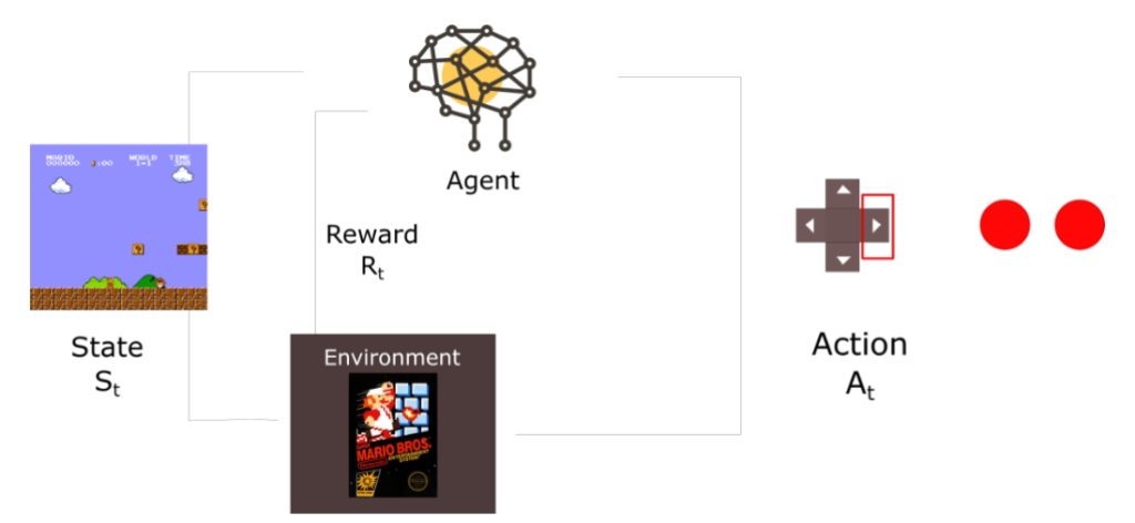 Con el tiempo, nuestro algoritmo de aprendizaje aprenderá a cometer menos errores que antes. Para cualquier problema de aprendizaje por refuerzo, necesitamos un agente y un entorno, así como una forma de conectar los dos a través de un circuito de retroalimentación.