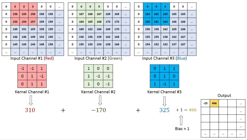 La entrada tiene 3 canales (R, G y B), lo que significa que nuestra imagen de entrada viene definida como 3 matrices bidimensionales, una para cada canal. Así que lo que hace la capa convolucional es aplicar la convolución por separado a cada canal; de esta manera se obtiene el resultado de cada canal, para luego sumarlos y obtener una única matriz convolucional 2D, que s llama mapa de activaciones.